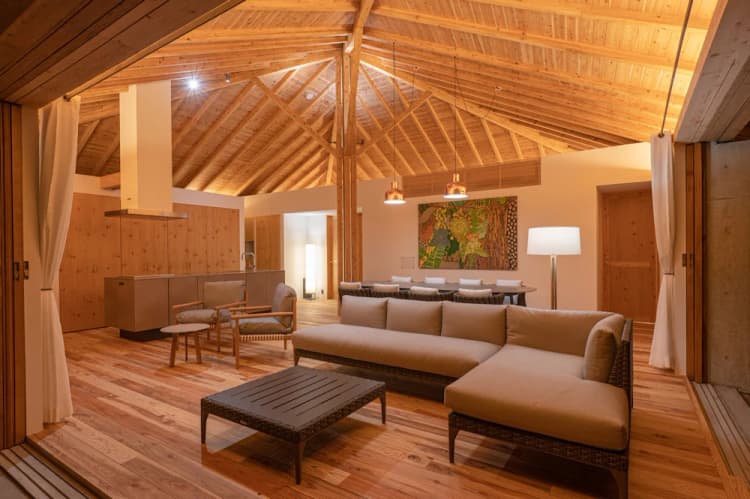 The facilities are luxurious, with living areas featuring comfortable bare-foot Yakushima cedar flooring and abundant use of Kagoshima timber. Bedrooms are equipped with custom-made 'IWATA Larkowl®' mattresses using high-quality natural fibers, promising a restful sleep.