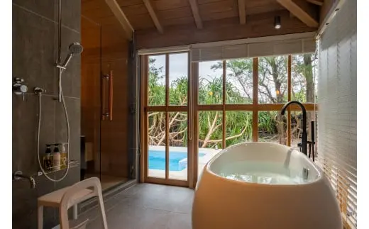 Opening the windows fully integrates the living room with the outside scenery, allowing relaxation while feeling the pleasant sea breeze and the sound of waves. Beach access is good, and experiences to enjoy Tokunoshima's rich nature, such as marine activities and eco-tours, are also prepared.