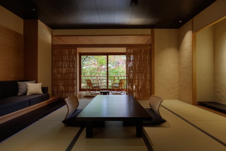 The ryokan is built surrounding the mountain garden, with an open structure that allows the outside scenery to flow in. From the guest rooms, you can relax in the open-air bath while gazing at the beautiful nature. A library is also available within the building, allowing for reading and meditation in a quiet space.